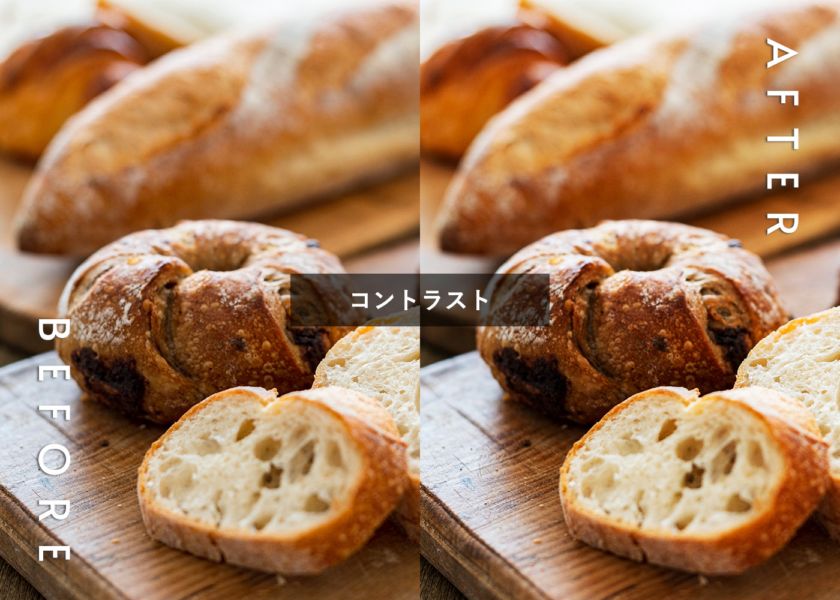 パンなど質感のある食品はコントラストをつけてディテールを強調するとシズル感が増します。