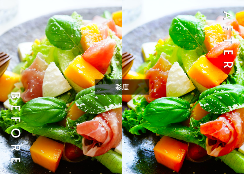 しかし、野菜などの緑色は調整すると青々しく新鮮な印象にすることができますが転びやすい色であるため注意が必要です。彩度だけでなく色相も調整して理想の色に近づけましょう。