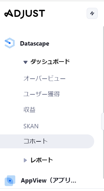 1.Adjustの管理画面 左メニュー 「Datascape」 > 「ダッシュボード」 > 「コホート」をクリック。