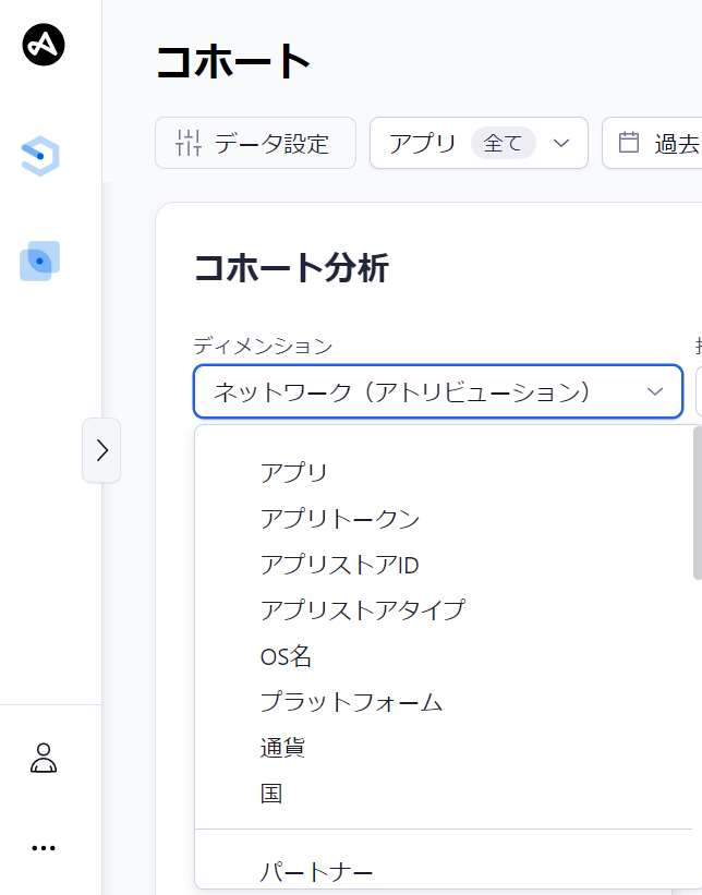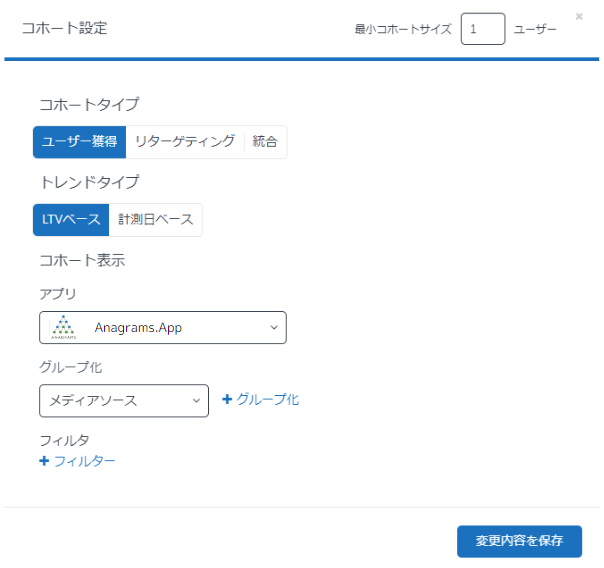 コホートタイプ:新規でインストールしたユーザーorインストール済みユーザーのどちらのデータを表示するかを設定します。