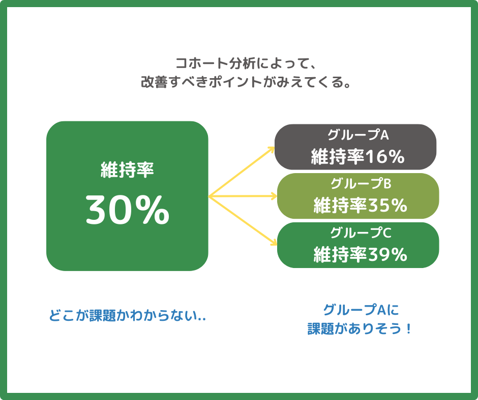 このように、維持率を分析する際には、具体的な仮説を導くためにコホート分析を上手く活用することがポイントとなります。