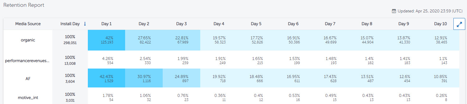 一方で、「AF」経由の場合はインストール数は少ないものの、インストール1日後の維持率が42.43%と非常に高く、その後1週間程度はOrganicより高い維持率が確認できます。