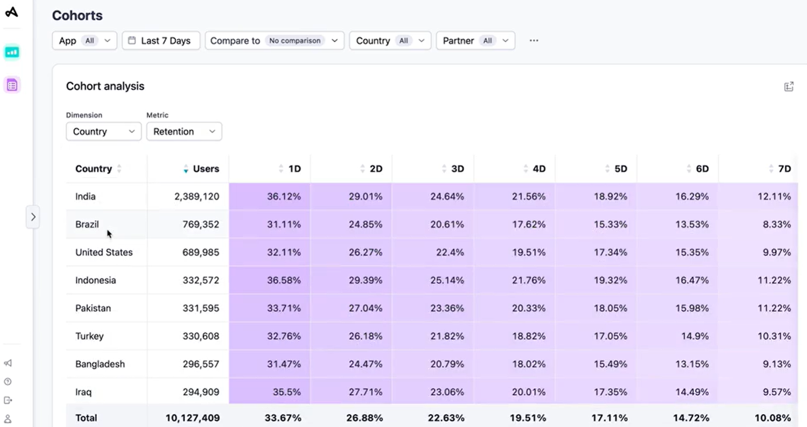 以下は、Adjustのヘルプページで紹介されている、ディメンションを「地域(国)」に設定したコホート分析です。
