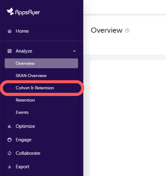 1.AppsFlyer管理画面 左メニュー Analyze > Cohort&Retention をクリック。