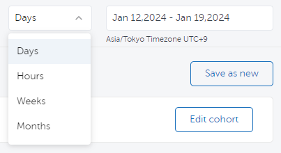 3.画面右上のプルダウンで、コホートの粒度と期間を選択します。(粒度では時間、日、週、月が選択可能)