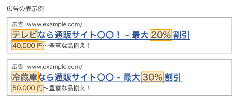 上の画像のオレンジ色の部分が挿入データで、こちらをキャンペーン・広告グループ・キーワード単位で動的に変更できます。
