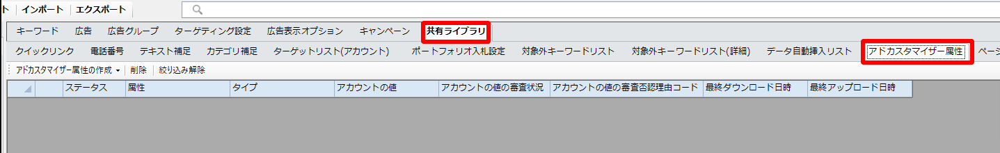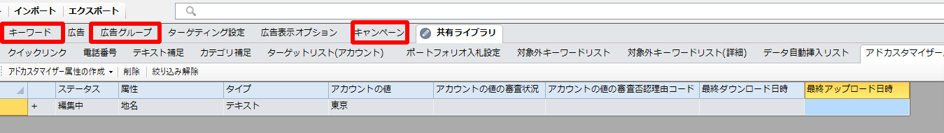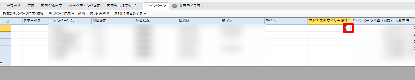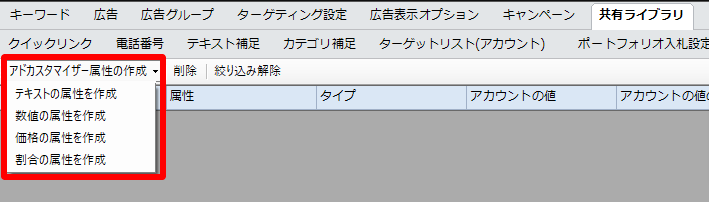 キャンペーンエディターを開き、「共有ライブラリ」から「アドカスタマイザー属性」を開きます。