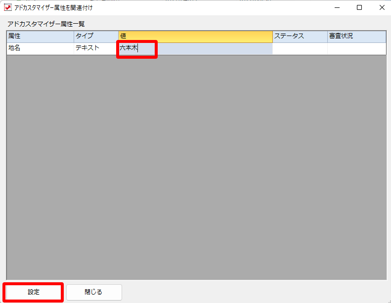 アドカスタマイザー属性一覧が表示されるため「値」の欄に広告文に挿入したい文言を入力し、「設定」を押下して完了です。