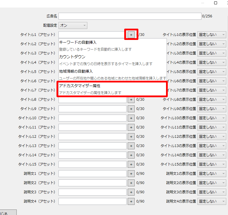 広告作成画面を開き、アセット入力欄の右側の「+」ボタンをクリック後、「アドカスタマイザー属性」を選択します。