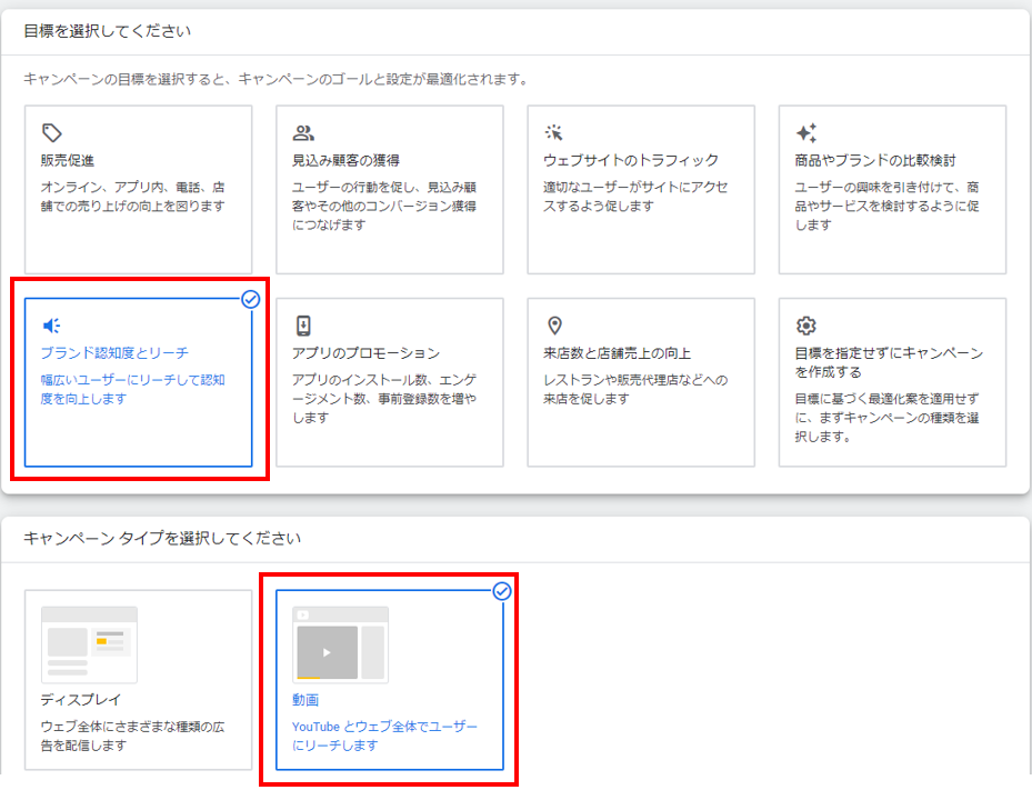 キャンペーン目標は「ブランド認知度とリーチ」を選択し、キャンペーンタイプは「動画」を選択します。