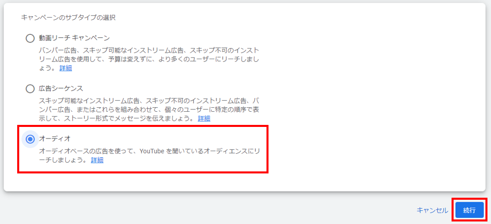 キャンペーンのサブタイプは「オーディオ」をクリックします。