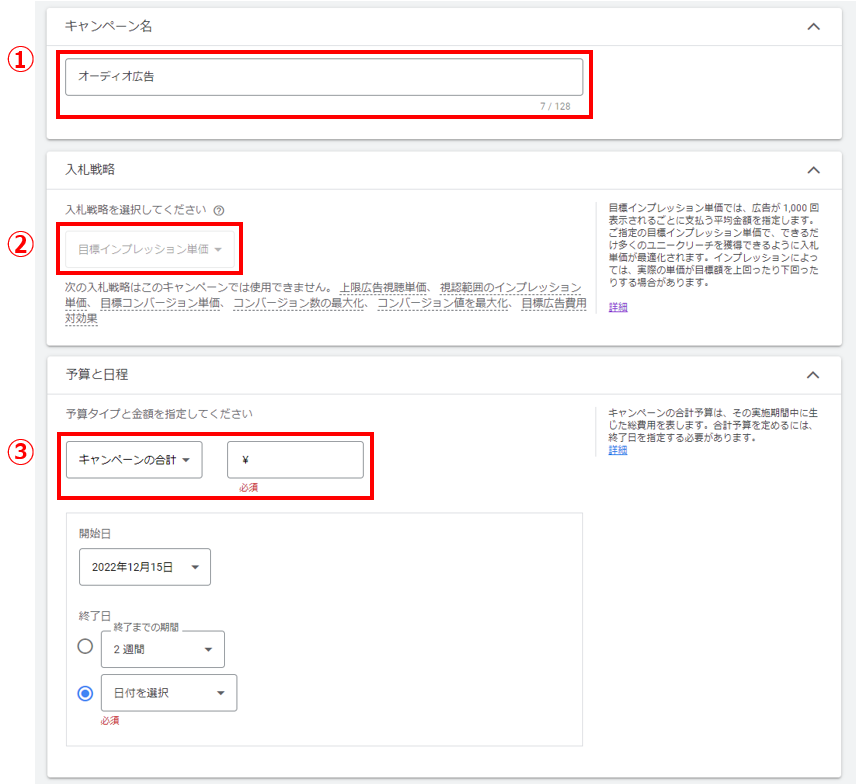 ※2023年12月時点、オーディオ広告で選択可能な入札戦略は「目標インプレッション単価」のみ選択できます。