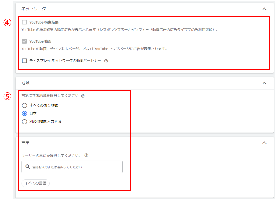 ※デフォルトで「ディスプレイ ネットワークの動画パートナー」のチェックボックスにチェックが入っていますが、「ディスプレイ ネットワークの動画パートナー」にはオーディオ広告は配信されません。念のためチェックを外しときましょう。