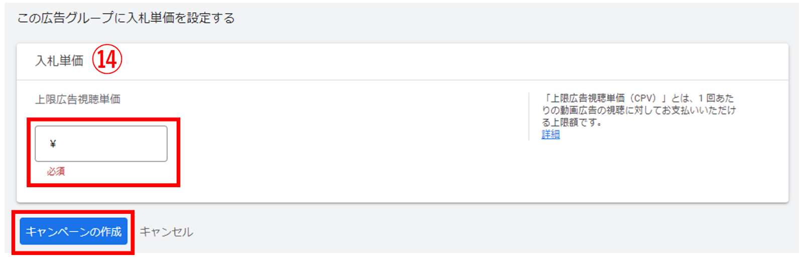 ⑭入札単価を設定して、[キャンペーンの作成]をクリックして完了です。