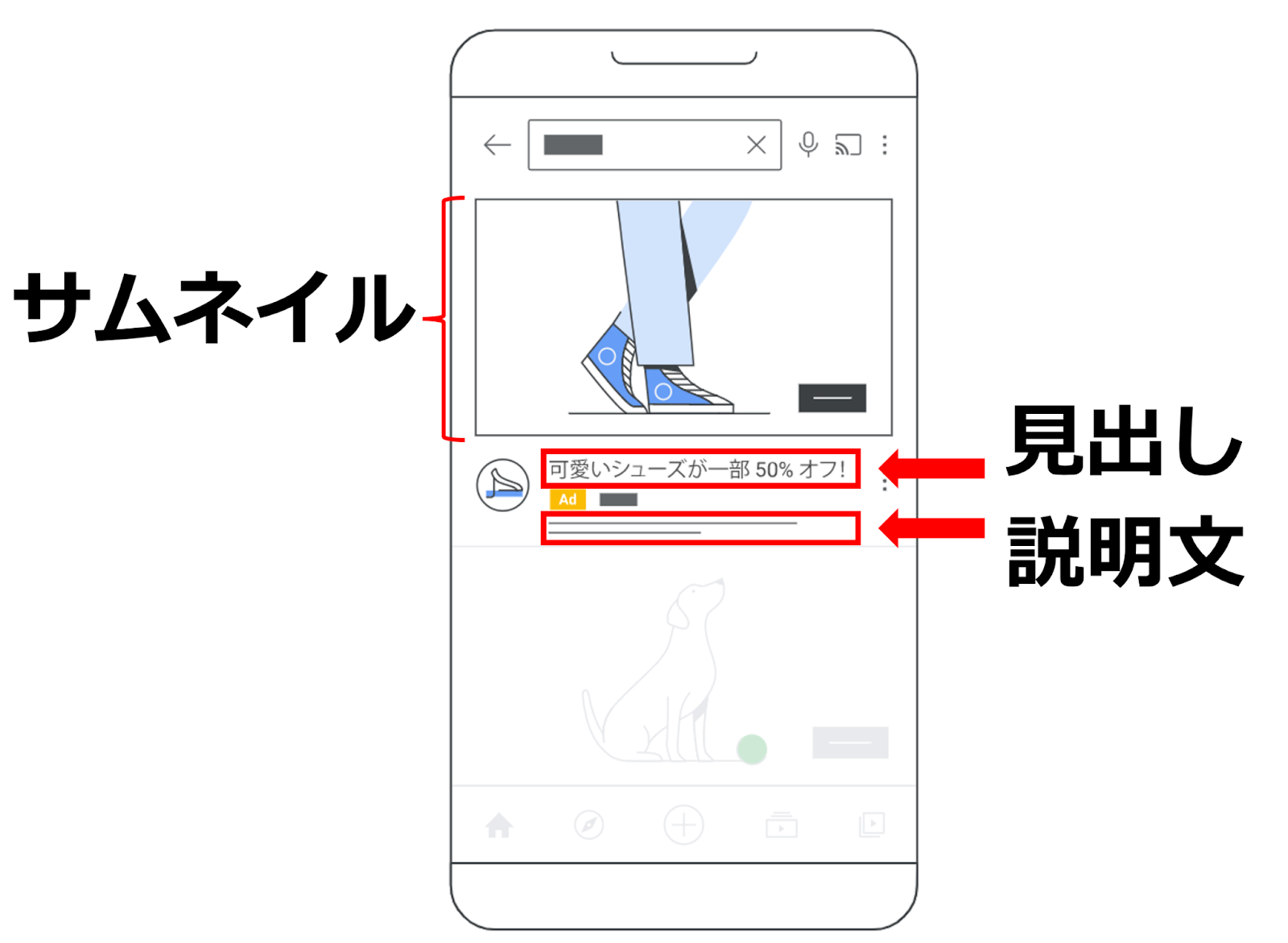 インフィード動画広告は、広告管理画面上で設定する広告訴求(見出し・説明文)と、広告で配信したいYouTube動画とサムネイル画像とが組み合わされて広告が表示されます。