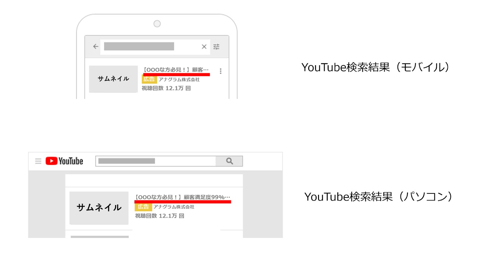 ユーザーがYouTube上で検索した「検索結果」の上部に広告が表示されます。ユーザーが検索してどの動画を視聴しようか選ぶときに、インフィード動画広告は必ずオーガニックの動画より上部に表示されるので視認性が上がり、視聴を促すことができます。