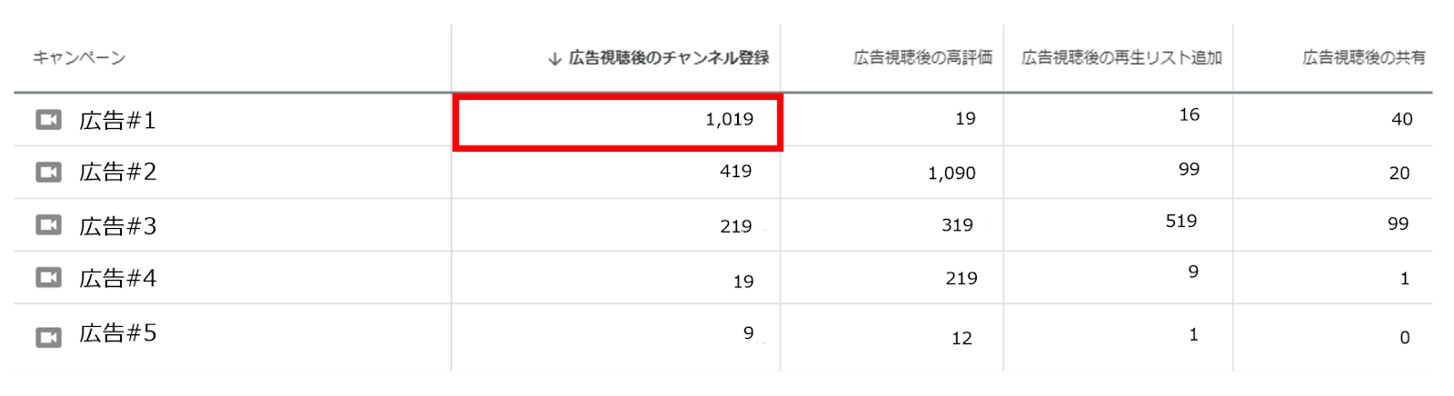 たとえば、広告配信の目的がブランドの認知拡大でチャンネル登録者数の増加を目標としてる場合、クリエイティブ「広告#1」は、広告動画視聴後のチャンネル登録者数に最も貢献している広告だと判断できます。