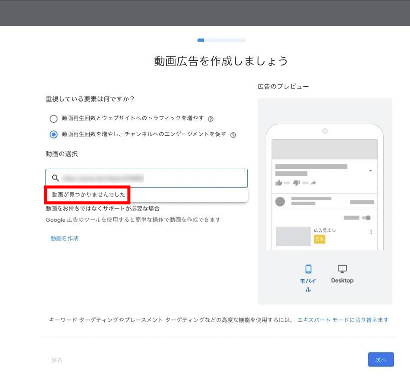 このように、非公開の動画URLを入力しても赤枠のように「動画が見つかりませんでした」と表示され、次に進むことができないようになっています。インフィード動画広告として配信するためには、YouTubeにオーガニック動画を投稿しておくことが必要です。