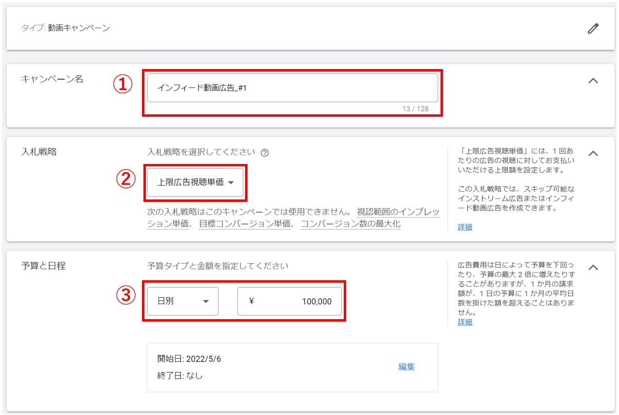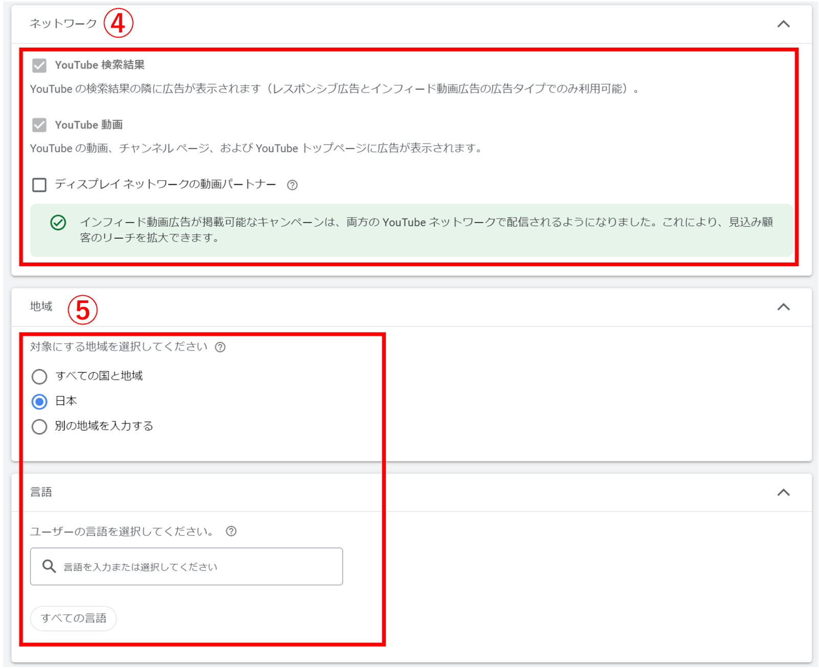 ※デフォルトで「ディスプレイ ネットワークの動画パートナー」のチェックボックスにチェックが入っていますがインフィード動画広告は配信されません。