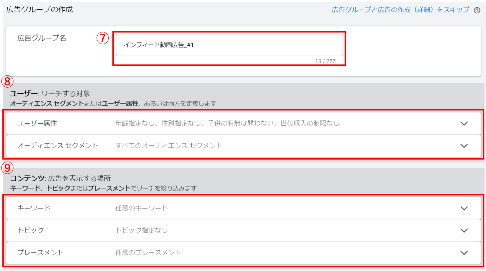 ⑧広告をリーチする対象を設定します。オーディエンスセグメントでは、興味関心や購買意欲、カスタムオーディエンスセグメントを利用してリーチする対象を設定をします。