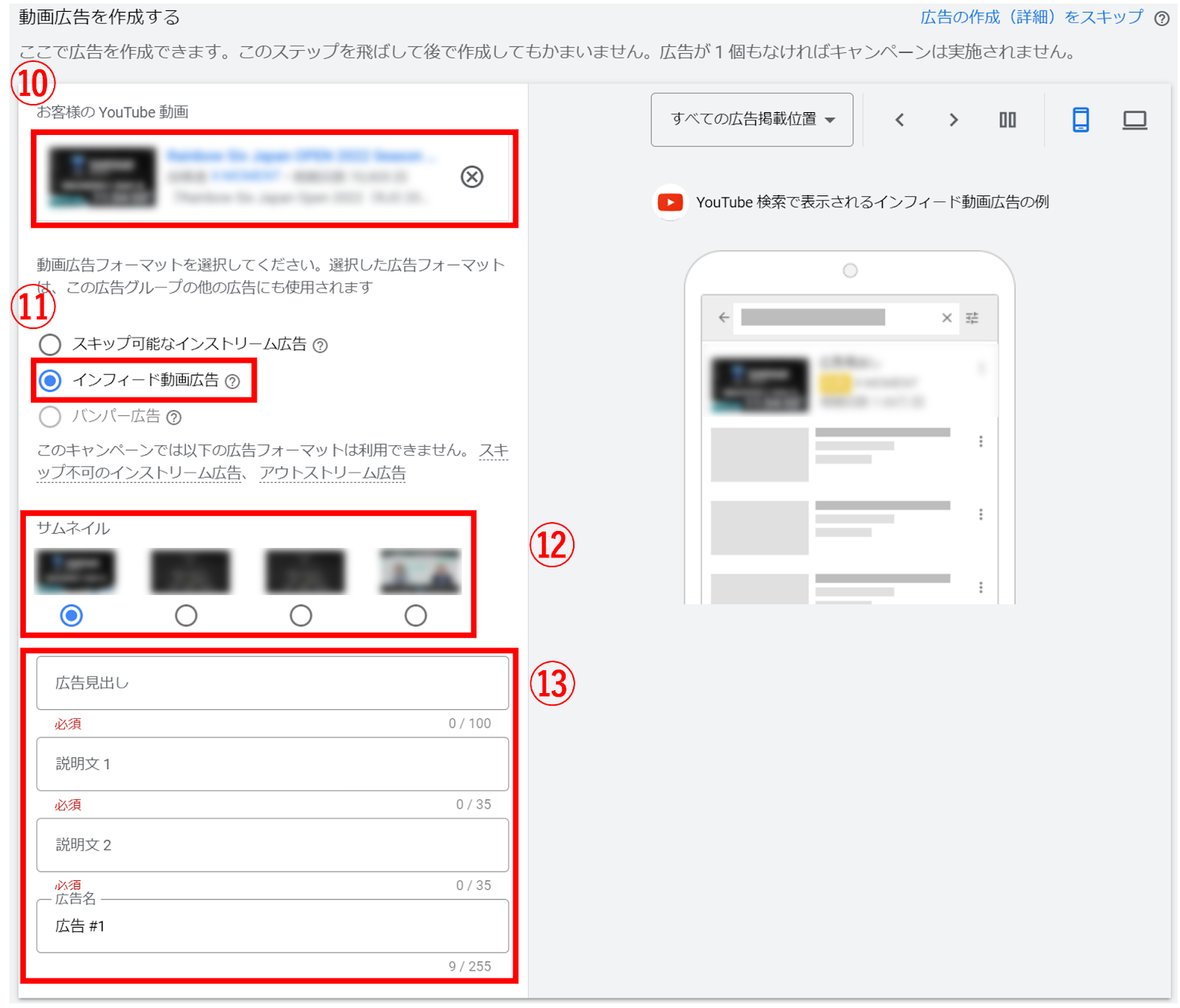 ⑩動画URLまたはキーワード検索をして、広告の遷移先となるYouTube動画を選択します。
