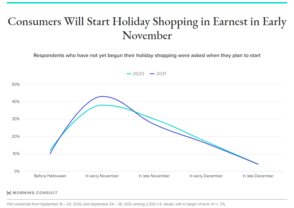 データインテリジェンス企業のMorning Consult社の調査では多くの顧客が11月初旬にクリスマスショッピングを始めたいという結果が出ていますが、2020年と比べてみると一部は半月ぐらい前倒しになっている模様です。