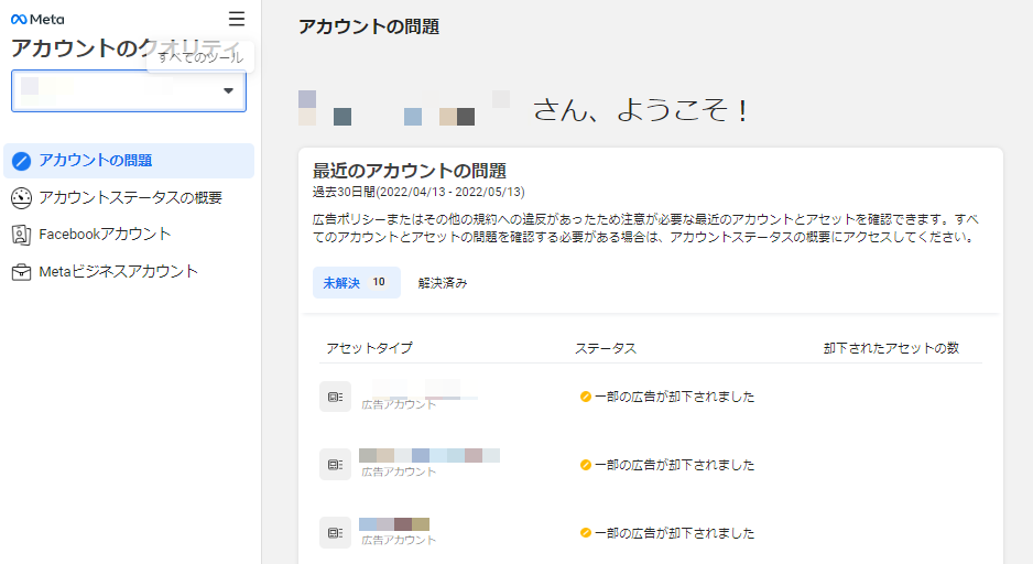 「アカウントのクオリティ」から「アカウントの問題」を表示し、各アセットタイプをクリックすると、停止・制限されているアカウントの詳細をみることができます。