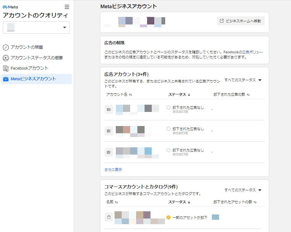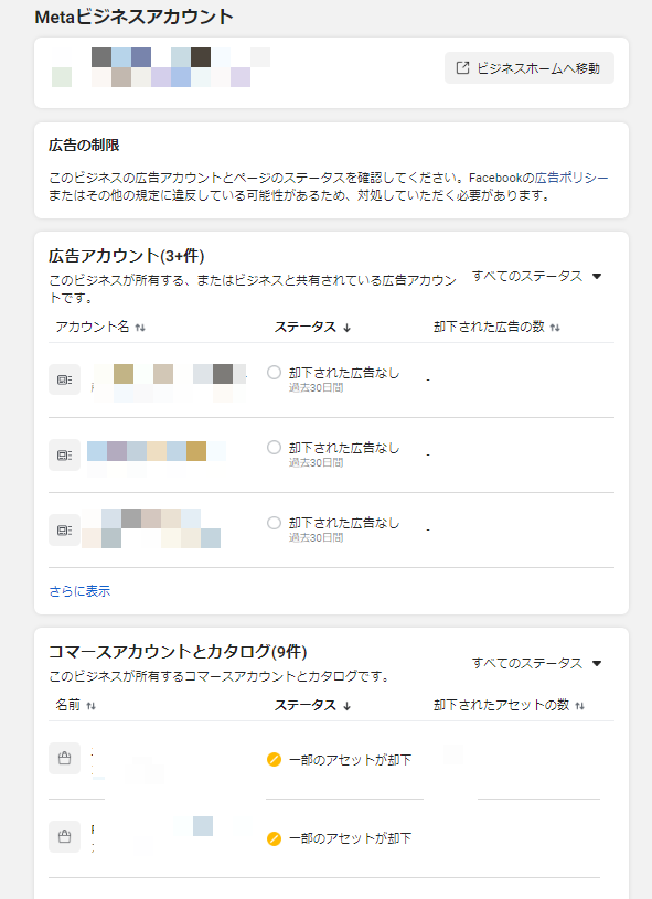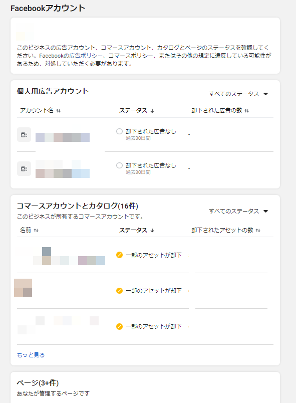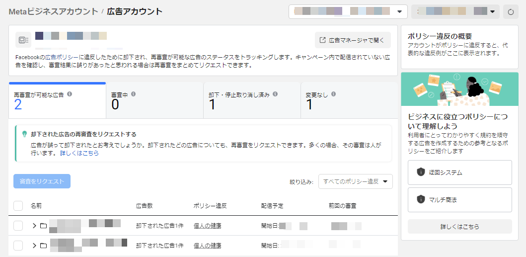 Facebookの広告のポリシーに違反・抵触しており注意が必要なビジネスアカウント、広告アカウント、Facebookページやその他アセットのステータスを確認したり、再審査依頼を出したりできます。