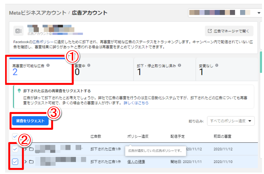 広告マネージャーでポリシーに合わせて広告を修正したうえで、以下の手順で再審査を行います