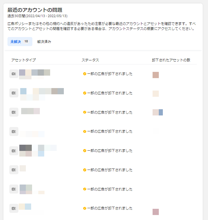 広告ポリシーまたはその他の規約への違反があったため注意が必要な最近のアカウントとアセットを確認できます。