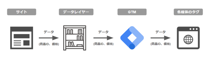 ユーザーがWebページを閲覧した際に、そのページ上のさまざまなイベントやデータ(例:商品ID、購入金額、ユーザーの行動など)を記録し、これをGoogleタグマネージャー(GTM)などのタグ管理ツールが取得できるようにします。