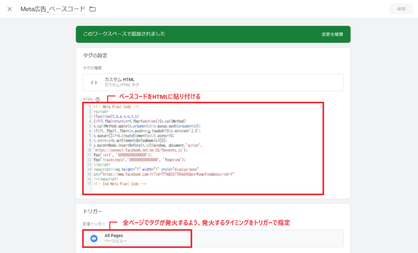 新規でMetaピクセルを実装する場合は、カスタマイズは不要です。ダウンロードしたベースコードを使用してください。