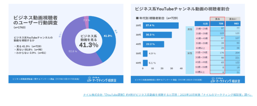 ナイル株式会社が2023年に実施した調査では、「YouTubeでビジネス系動画を視聴している」と回答したユーザーは約4割にのぼりました。視聴層も20代から40代を中心に広がっており、これは多くの企業にとってターゲットとなる購買・選定関与者層にあたります。この調査は2023年10月時点の情報であり、視聴者数はさらに増えていると考えられます。