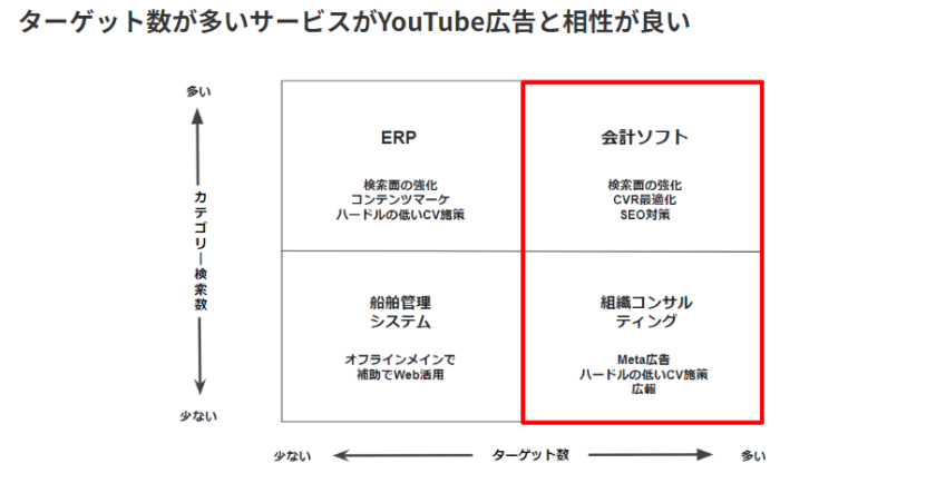 上記の図のようにどのような業界でも入るようなサービスやSMB向けの商材のようなターゲット数が多い商材がYouTube広告と相性が良い傾向にあります。
