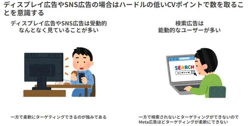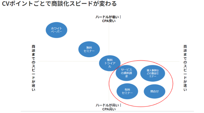 いきなり問い合わせを獲得するというよりも資料請求やホワイトペーパー、セミナーなどまずは気軽に情報収集してもらうようなCVポイントが望ましいです。