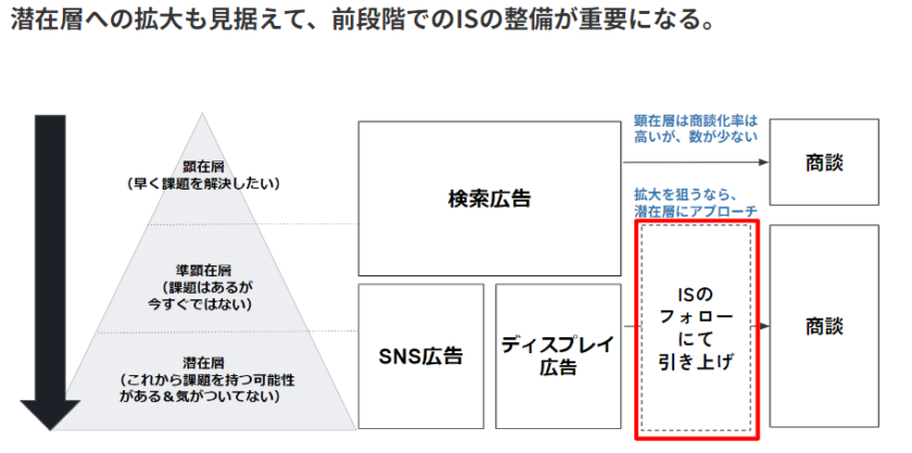 そのため、上記の図のようにホワイトペーパーやセミナーなどの検討段階の浅いリードに対してはアプローチを変えて商談を生み出していくことが重要になります。