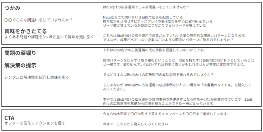 冒頭で興味を引き、動画を最後まで読み進めると今すぐコンバージョンしたくなるようなストーリーに台本を仕上げる必要があります。基本的には冒頭のつかみで興味を引いた後に教育コンテンツを挟み、問題や課題を深堀りします。その後にその問題の解決策を提示し、その解決策が商品やホワイトペーパー、セミナーなどのコンバージョンポイントで解決することを伝えてます。最後に今すぐ行動してもらうために CTA(コールトゥアクション)を伝えます。