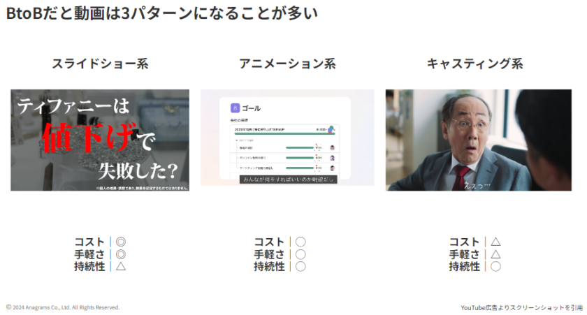 YouTube広告では動画の「型」にもいくつかのパターンがあり、それぞれ得意な伝え方があります。商材の特性やリソース状況に応じて適切な表現手段を選ぶことが重要です。