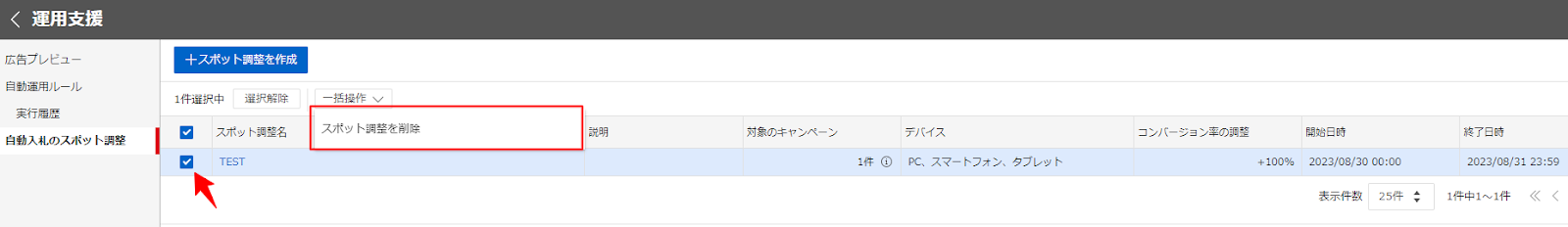作成したスポット調整は一覧に表示されます。該当のスポット調整名をクリックすると編集ができ、チェックを入れて「スポット調整を削除」で削除も可能です。