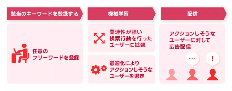 キーワード型:広告主が設定したフリーワードをもとに、検索履歴などから関連性の高いユーザーを自動で拡張・リスト化