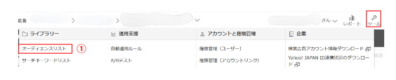 ①広告管理ツール右上にある「ツール」をクリックして、「ライブラリー」から「オーディエンスリスト」を選択します。