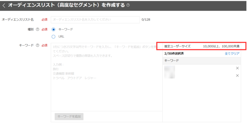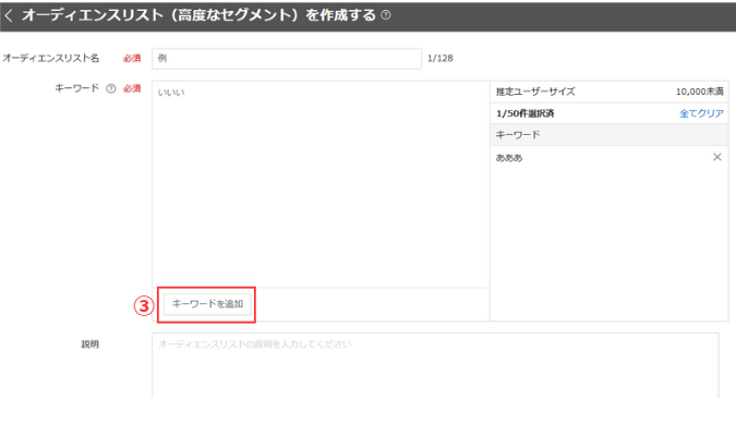 ③「オーディエンスリスト名」「キーワード」を入力し、「キーワードを追加」をクリックするとキーワードがリストに追加されます。