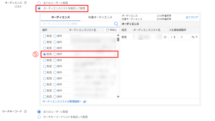 ⑤広告グループのターゲティングをサーチキーワードターゲティングからオーディエンスリストターゲティングに紐づけを切り替え、作成した高度なセグメントのリストについて「配信」のステータスをONします。