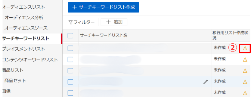 ②サーチキーワードリスト一覧から、移行するリストの「移行用リスト作成状況」欄のアイコンをクリックします。