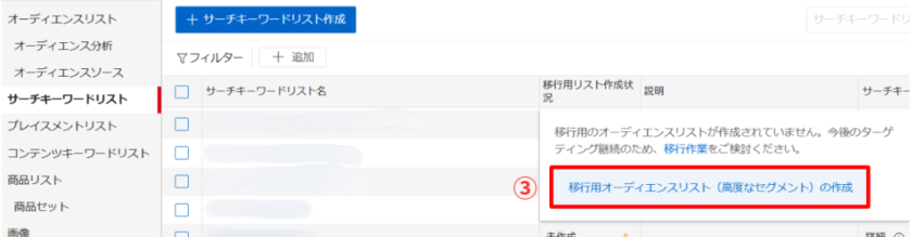 ③表示されるアラートから「移行用オーディエンスリスト(高度なセグメント)の作成」をクリックします。