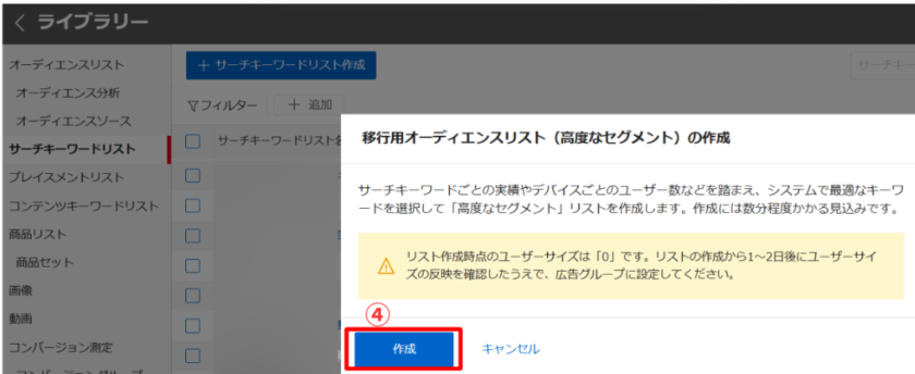 移行機能で作成できるリスト数の上限は、他のオーディエンスリストとの合計で400件です。移行後のリストが400件を超える場合は、事前に不要なリストを削除してください。
