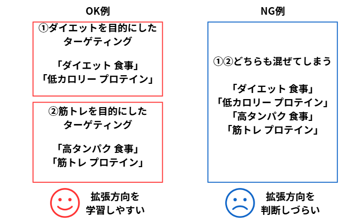 NG例ではターゲットが混在するため、ユーザーに応じた広告訴求がしづらくなるでしょう。また、ターゲティングの拡張もどちらの文脈に広がっているのか想定しづらくなります。