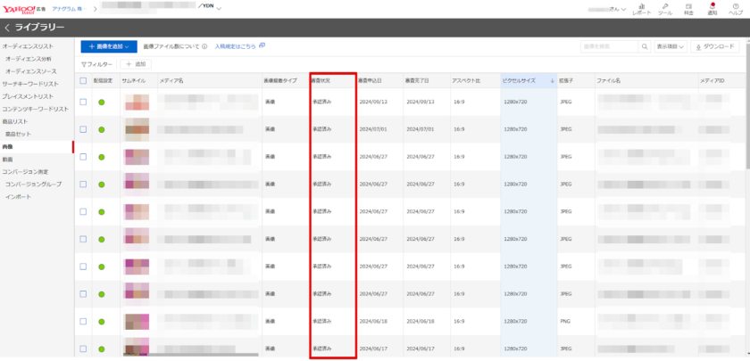 すでに管理画面のライブラリーにアップロードしている画像や動画審査が完了しているかの確認は、下記の手順で行います。