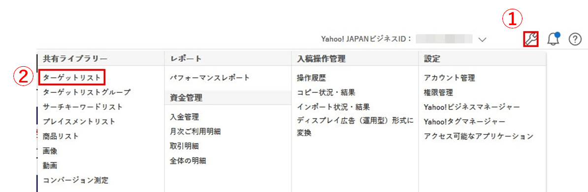 ①広告管理ツールの右上にあるスパナ型のアイコンをクリックします。