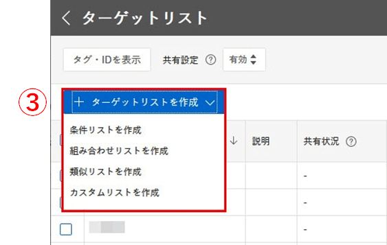 ③「ターゲットリストを作成」ボタンを押し、「カスタムリスト」を選択します。
